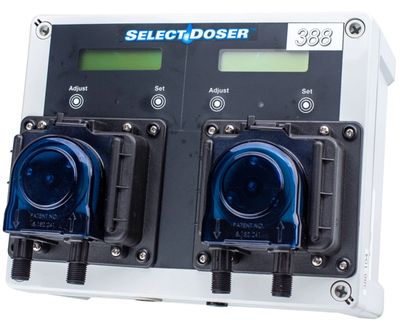 The Select Doser™ 388 is designed with two screens and two pump heads and can dose two products at two different dosing ratios using only one flow sensor. This unit can inject into water lines with pressure of up to 80 PSI and is ideal for treating water or medicating water requiring two different products. The peristaltic design keeps aggressive products such as chlorine, acid and hydrogen peroxide inside the pump tube and away from the working parts of the pump to prevent corrosion.
